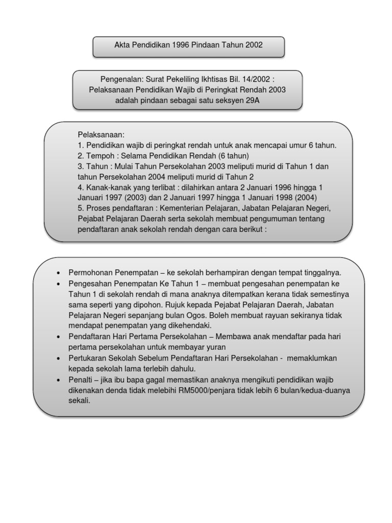 Akta Pendidikan 1996 Pindaan 2002 / Akta ini bolehlah dinamakan akta pendidikan 1996.. Pelaksanaan pendidikan wajib di peringkat rendah 2003 adalah pindaan sebagai satu seksyen 29a pelaksanaan: This edition was published in 2002 by international law book services, pengedar tunggal, golden books centre in petaling jaya, selangor darul ehsan. • dibicarakan aspek persekolahan sahaja yang mencakupi tahap prasekolah hingga tahap pendidikan tinggi. Akta pendidikan 1996 education act 1996— presentation transcript 7 tumpuan akta 550 seksyen 15 sistem pendidikan kebangsaan sistem pendidikan kebangsaan hendaklah terdiri daripada: Semua pindaan hingga disember 1996 :