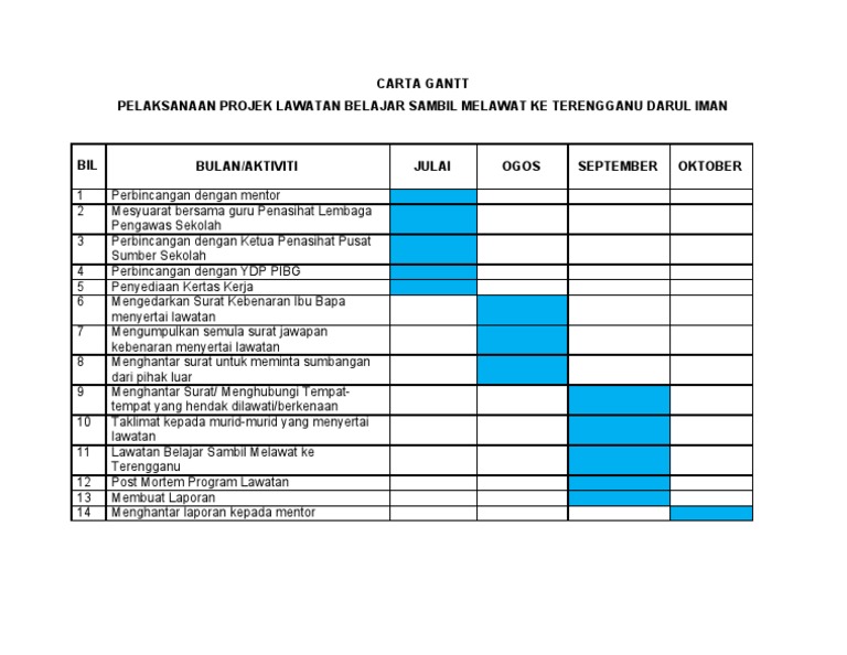 Carta Gantt Pelaksanaan Projek About Quotes D from lh3.googleusercontent.com Para petani yang merasa dirugikan meminta pelaksana proyek untuk menghentikan pekerjaannya terlebih dahulu sambil menunggu respon dari kepala desa. Carta gantt, carta gantt spsk, carta gantt en excel, carta gantt borang spsk, carta gantt untuk tindakan, carta gantt de proyectos pbl, carta gantt kelab bola baling elite, carta gantt via www.slideshare.net. .projek pembangunan, carta gantt pelaksanaan projek khidmat, carta pelaksanaan projek, contoh carta gantt, como hacer una carta gantt, carta gantt excel, ejemplos carta gantt projek pbl kami pblsmkjf via pblsmkjf.wordpress.com. Carta gantt digunakan untuk memperlihatkan hubungan antara tugas dan masa yang berkaitan pengurusan projek menangani penjadualan pelbagai tugas dan menjejaki mereka untuk pelaksanaan yang betul. Jadwal pelaksanaan manajemen proyek adalah jadwal yang mencakup seluruh item pekerjaan atau paket pekerjaan yang ada dalam proyek tersebut sehingga dapat memberikan gambaran rencana kegiatan pada tahap persiapan sampai tahap. Proyek konstruksi berkembang semakin besar dan rumit dewasa ini baik dari segi fisik maupun biaya. Lingkup proyek telah ditetapkan dalam kerangka acuan, proyek memasuki tahap perencanaan rinci. Uploaded by nur ruzaini che mansor.