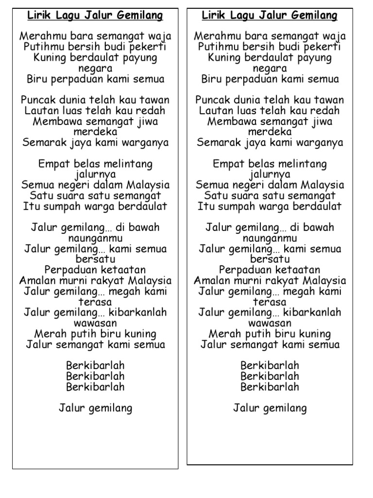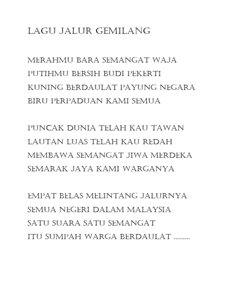 Lirik Lagu Jalur Gemilang from imgv2-2-f.scribdassets.com Download lagu mp3 & video: Untuk melihat detail lagu jalur gemilang klik salah satu judul yang cocok, kemudian untuk link download jalur gemilang ada di halaman berikutnya. Jalur gemilang mp3 & mp4. ★ myfreemp3 helps download your favourite mp3 songs download fast, and easy. Download lagu jalur kuning mp3 ✖. Lagu jalur gemilang terbaru gratis dan mudah dinikmati. Download mp3 jalur gemilang gratis, ada 20 daftar lagu jalur gemilang yang bisa anda download. Jalur gemilang maksud lambang dan warna bendera malaysia jalurgemilang lagujalurgemilang.