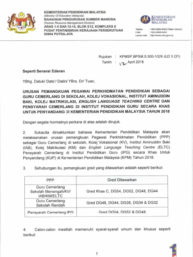 Kementerian pendidikan malaysia (kpm) akan melaksanakan urusan pemangkuan guru cemerlang gred dg44 hingga ke gred khas c dan pensyarah cemerlang gred dg48 hingga ke gred dg54 secara khas untuk penyandang (kup) bagi tahun 2018 bermula 16 april 2018 sehingga 18 mei 2018.
