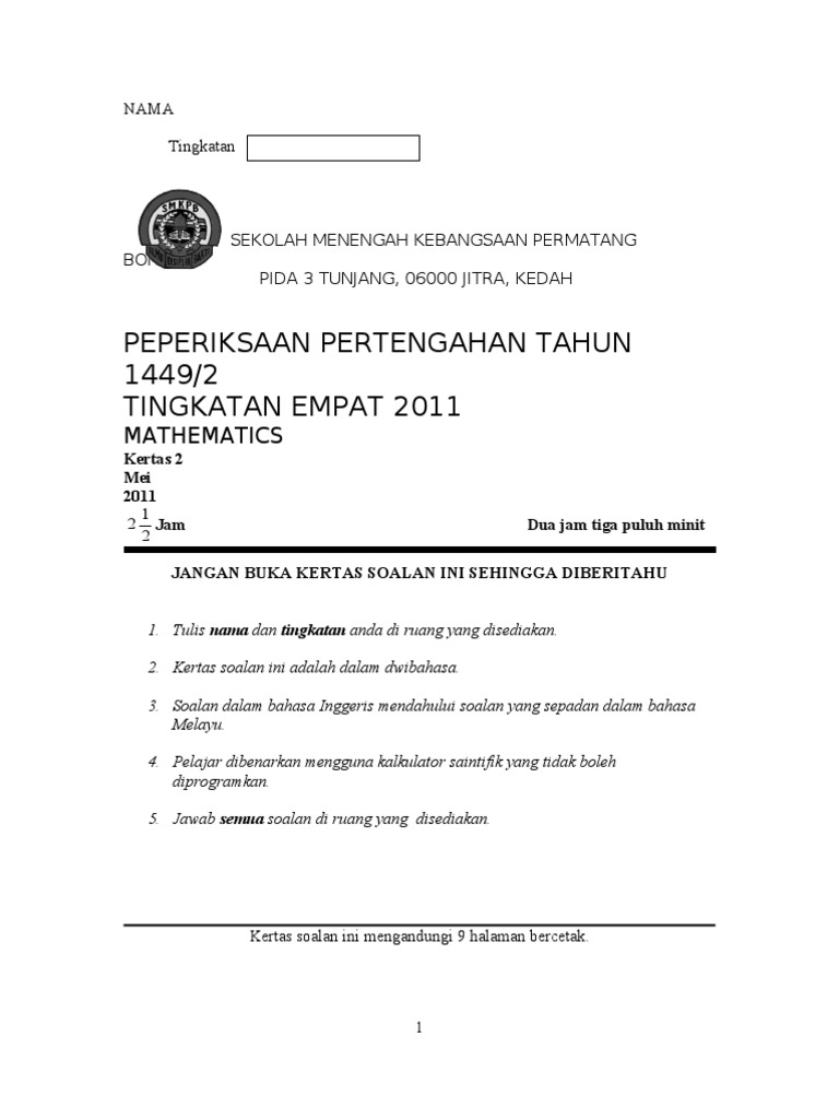 Related : Soalan Matematik Tingkatan 4 Kertas 2 / Soalan matematik tingkatan 4 peperiksaan pertengahan tahun matematik tingkatan 4 contoh soalan matematik tingkatan 4 kertas satu soalan matematik tingkatan 4 peperiksaan peperiksaan pertengahan tahun matematik tingkatan 4 kertas 2..