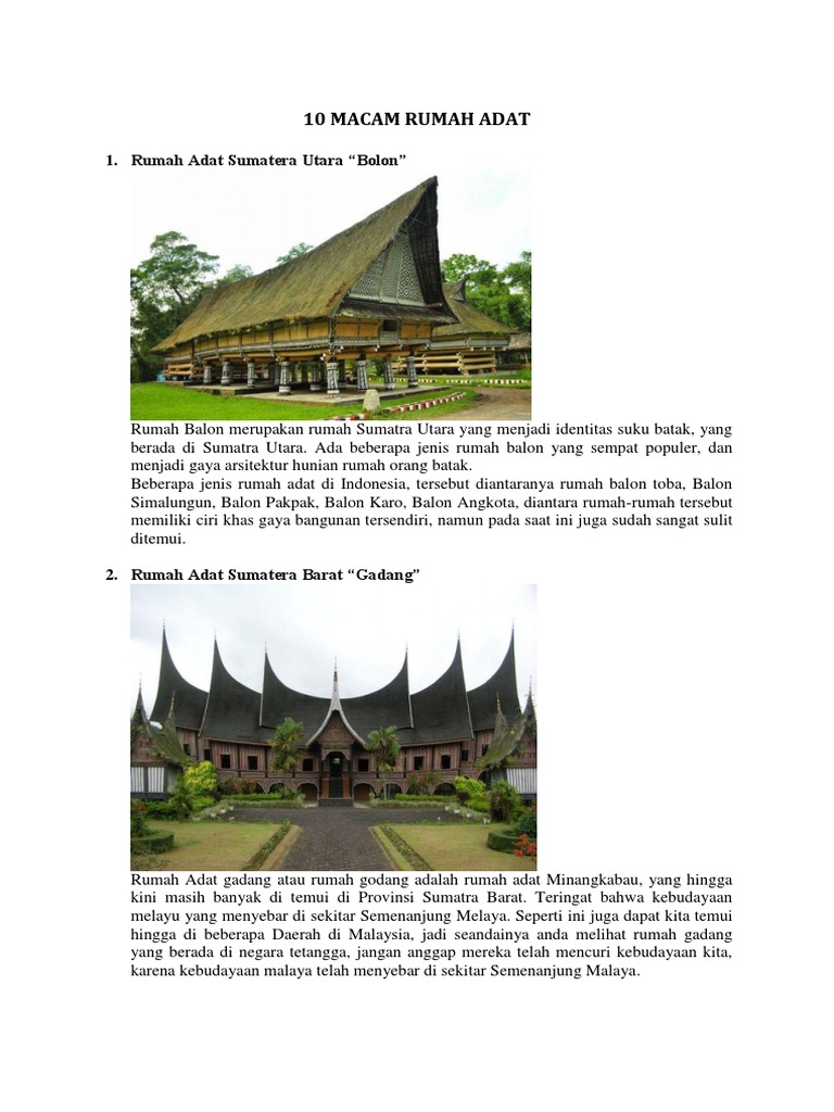Meski demikian, beberapa jenis rumah adat yang terdapat di riau ini ada yang menggunakan atap. Dahulu, pada kehidupan masyarakat melayu, rumah tradisional bisa memiliki fungsi yang beragam, contohnya sebagai tempat tinggal dan tempat upacara adat. Setelah mengetahui beberapa jenis rumah adat yang ada di riau alangkah baiknya apabila kita juga mengetahui bentuknya. Adanya beberapa jenis jenis rumah tinggal yang dibangun di perkotaan ternyata juga menyebabkan budaya betawi hampir tergerus. Kesenian pertukangannya disampaikan secara turun temurun dari generasi ke generasi. Rumah tradisional melayu masih menjadi 'trend' dan pilihan ramai untuk mendiaminya meskipun kelihatan 'kekampungan'. Rumah tradisional terdapat di kawasan kampung atau luar bandar.contohnya : Terdapat pelbagai jenis baju tradisional melayu yang telah melalui evolusi. Tanpa sebuah budaya,idealisme manusia akan hilang. Rumah melayu atap limas potong adalah rumah adat tradisional suku melayu yang hidup di riau. Trulli merupakan rumah tradisional yang hanya dapat kita temukan dari kota alberobello, provinsi bari, italia. Gaya baju tradisional ini telah dipakai oleh golongan istana dan golongan bangsawan dan kemudian menjadi ikutan rakyat jelata. Ia cukup popular dikalangan raja dan bangsawan.